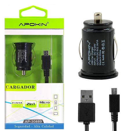 Cargador de coche APOKIN 2.1A con cable microUSB, compatible con todos los dispositivos que tengan conector microUSB, permite dos cargas simultaneas gracias a sus 2 puertos USB. Diseño compacto y ligero que te permite realizar la cargar de tu smartphone en cualquier momento y lugar.