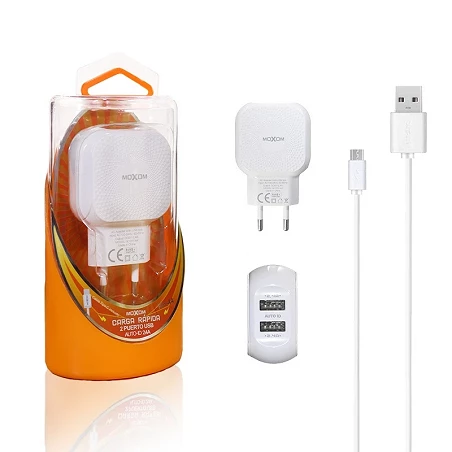 Cargador de red Moxom KH-44 con cable MicroUSB, compatible con todos los dispositivos. Diseño compacto y ligero permite dos cargas simultaneas gracias a sus 2 puertos USB.