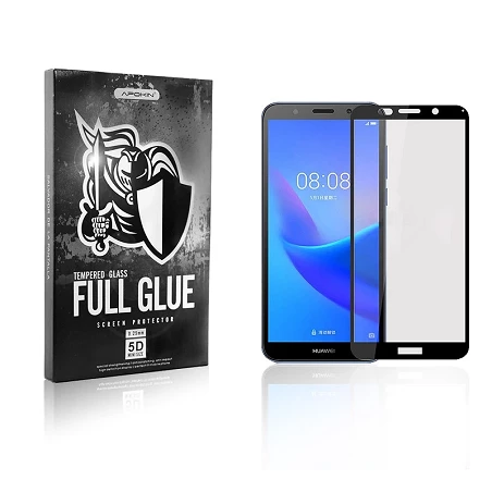 Protector de Cristal Full Glue 5D (Pegamento Completo) para Huawei Y5 2018 en color Negro. Cobertura Total de la pantalla, protege tu teléfono con la garantía y calidad de la marca APOKIN.