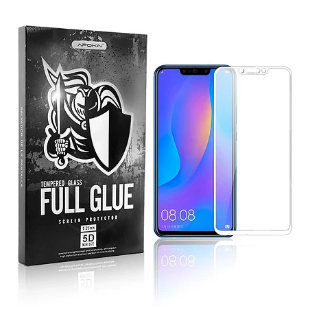 Protector de Cristal Full Glue 5D (Pegamento Completo) para Huawei P Smart Plus en color Blanco. Cobertura Total de la pantalla, protege tu teléfono con la garantía y calidad de la marca APOKIN.