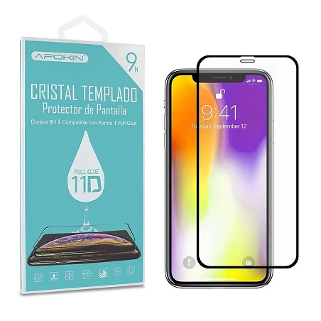 Protector de Cristal Full Glue 11D Premium (Pegamento Completo) para iPhone Xs Max en color Negro. Cobertura Total de la pantalla, protege tu teléfono con la garantía y calidad de la marca APOKIN.