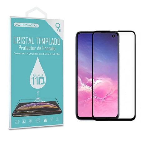 Protector de Cristal Full Glue 11D Premium (Pegamento Completo) para Samsung Galaxy S10E en color Negro. Cobertura Total de la pantalla, protege tu teléfono con la garantía y calidad de la marca APOKIN.