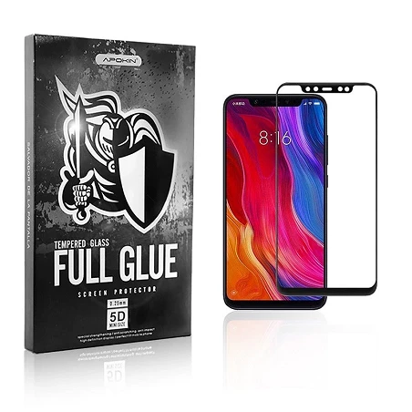 Protector de Cristal Full Glue 5D (Pegamento Completo) para Xiaomi Mi 8 en color Negro. Cobertura Total de la pantalla, protege tu teléfono con la garantía y calidad de la marca APOKIN.