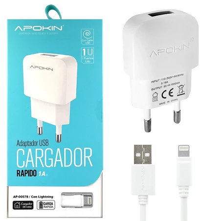 Carregador de rede APOKIN 1A com cabo Lightning, compatível com todos os dispositivos com conector Lightning. Design compacto e leve que permite carregar o seu smartphone em qualquer momento e local.