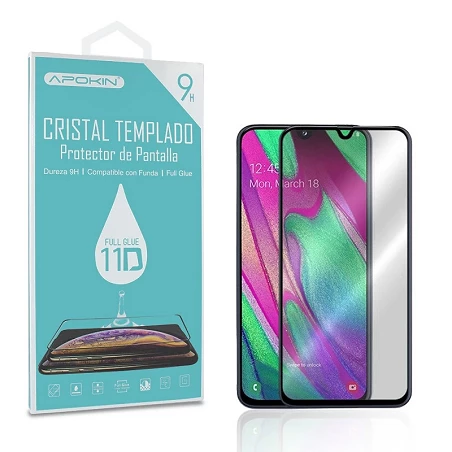 Protetor de vidro premium de cola completa 11D para Samsung Galaxy A40 em preto. Cobertura total da tela, proteger seu telefone com garantia de marca e qualidade APOKIN.
