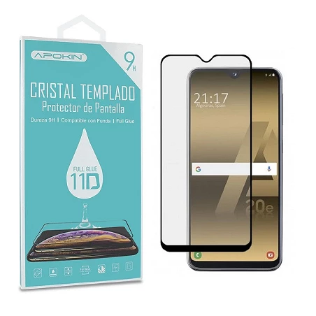 Protetor de vidro premium de cola completa 11D para Samsung Galaxy A20E em preto. Cobertura total da tela, proteger seu telefone com garantia de marca e qualidade APOKIN.